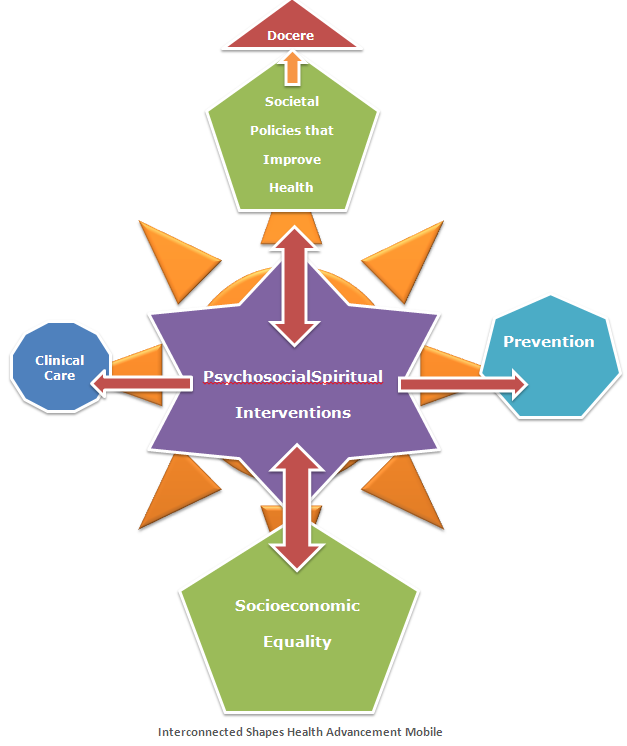 Because a primary impediment to the implementation of effective public health policies may be psychosocialspiritual in nature and because socioeconomic interventions are unsupportable under the current infrastructure therefore, the centerpiece of the Interconnected Shapes Health Advancement model must be a psychosocialspiritual entity and not a socioeconomic one. Additional support for this centerpiece is that effective psychosocialspiritual interventions have a cascading ability to positively impact interventions in numerous other areas. It has been overwhelmingly demonstrated across cultures that those on the bottom of the socioeconomic ladder have worse health just due to their inferior social status alone, independent of their access to or utilization of health care services, genetic or other environmental health risks.[13] In fact, there is a dose-response relationship between inferior social status and increased drug addiction, crime, teen pregnancy as well as declining levels of health.13 The reasons for this are hypothesized to relate to the stress evoked by the framework set up by social status hierarchies in which a great deal of insecurity results for status competition, the precariousness of one’s position in social ranking and the stress and depression generated by the sense of inferiority resulting from perceived or actual lowly status in such a hierarchy. Social inequity generates higher levels of stress/anxiety, anger/hostility and depression and it is well known that stress dysregulates immune function and is an independent risk factor for many common diseases.13 High depression scores and lack of social support predict myocardial infarction and all-cause mortality.[14] Anxiety (p<.0000001) and depression (p=.00003) as well as anger and hostility (p<.0000001) have been shown to be significantly related to coronary artery disease.[15] There is ample evidence that increased levels of stress, anxiety and depression lead to an increase in negative health behaviors such as smoking and overeating and others.
