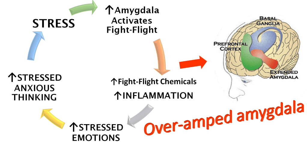 The vicious cycle is set off by stress, which triggers activation of the amygdala, which in turn causes the release of fight-or-flight response chemicals. These chemicals trigger more inflammation, which sets off even more activation of the amygdala. The process feeds on itself leading to a hyperactive amygdala that reacts to the tiniest of stimuli and creates anxiety and depressive mood.