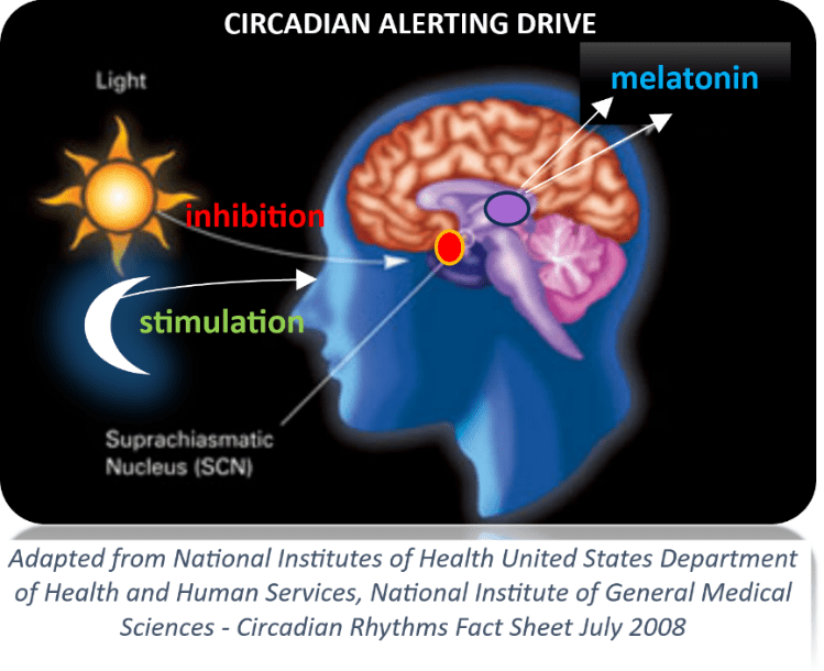Light levels, as well as the color of the light hitting our eyes, control melatonin levels via a brain structure known as the suprachiasmatic nucleus (SCN). The SCN directs the pineal gland to either shut down or ramp up melatonin production depending on the type of light hitting the eyes.