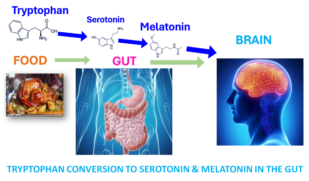 The main route of melatonin manufacture is one in which tryptophan that has traveled from the gut to the brain, is converted into serotonin and then to melatonin by enzymes located in the brain structure called the pineal gland. Both melatonin and serotonin play a role in sleep. Serotonin plays many roles in the body but it is most well-known for its role in regulating mood.