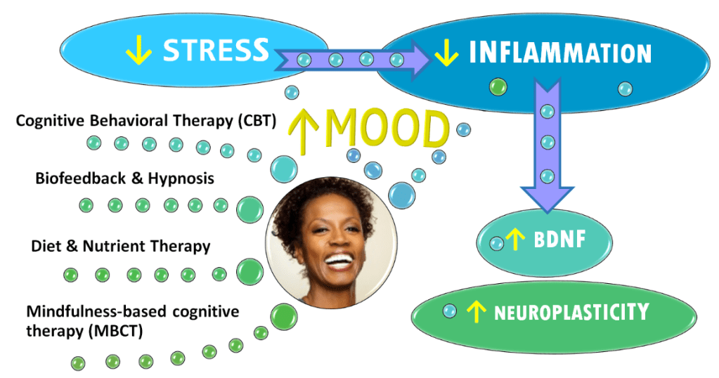Exercise24 and stress management25 both slash inflammation. And exercise and mindfulness-based practices both markedly boost BDNF and neuroplasticity. 26 Anti-inflammatory diet can improve depression and cut inflammation. 27